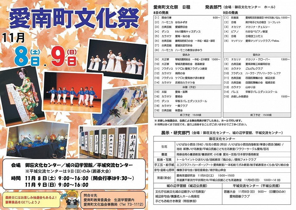 その他、愛南町文化協会員による作品展示、舞台発表のほか、お茶会やお楽しみ抽選会も行います。